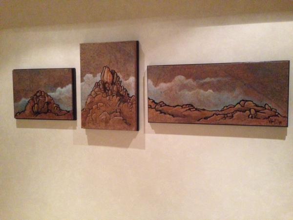 This three paneled depiction of Pinnacle Peak is acrylic on paper over wood was created for a client's dining room