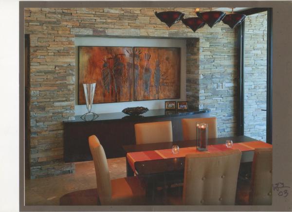 This large five piece abstract has diminishing panels and fills this dining room perfectly